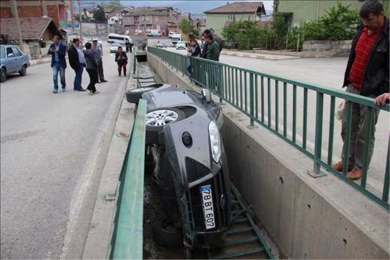 Edinilen bilgiye göre kaza, Aydınlıkevler Mahallesi Tevfik Fikret Caddesi üzerinde meydana geldi. Şükrü Yılmaz yönetimindeki 78 BT 607 plakalı otomobil, sürücüsünün direksiyon hakimiyetini kaybetmesi sonucu kontrolden çıkarak demir korkuluklara çarptıktan sonra su kanalına düştü. 1,5 metrelik kanalda yan duran otomobilin sürücüsü Şükrü Yılmaz ile 11 yaşındaki kızı Sena Yılmaz hafif yaralandı. Çevredekilerin yardımıyla araçtan çıkarılan yaralılar ambulansla Karabük Eğitim ve Araştırma Hastanesi´ne kaldırılarak tedavi altına alındı. Yaralıların durumunun iyi olduğu belirtilirken bir süre araç trafiğine kapatılan yol yeniden trafiğe açıldı.