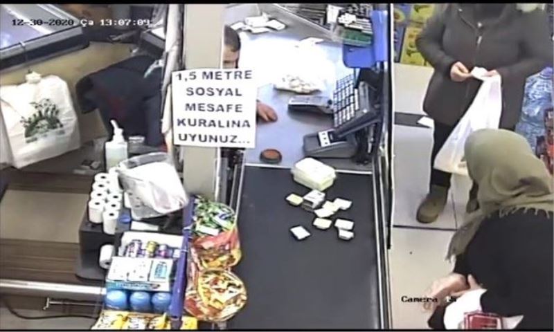Arkadan gelen başka bir yaşlı kadın, unutulan 50 TL´yi fark ettirmeden eline alıp çantasına koydu. O anlar marketin güvenlik kamerasına an be an kaydedildi.