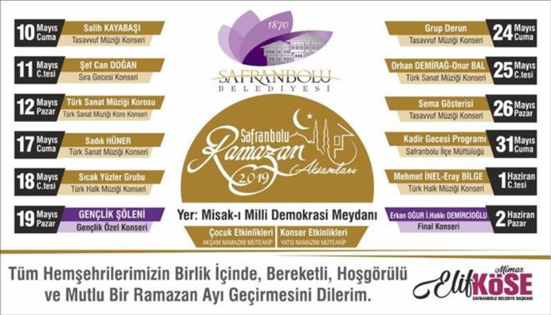 Safranbolu Belediyesi tarafından düzenlenen Cuma, Cumartesi ve Pazar günleri Misak-ı Milli Meydanında akşam namazının ardından gerçekleştirilecek olan Ramazan Akşamları bugün başlıyor.