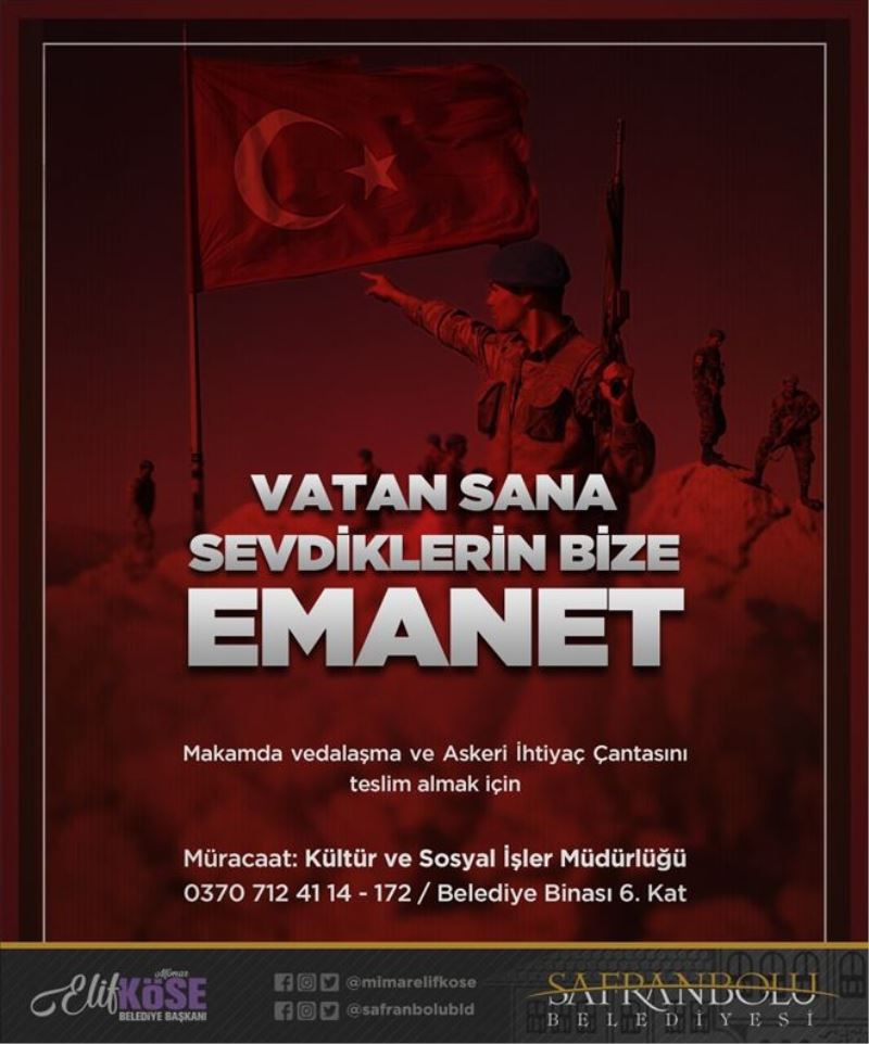 Askeri ihtiyaç çantasını teslim almak için belediyenin Kültür ve Sosyal İşler Müdürlüğüne müracaat edilebilecekleri ifade edilen açıklamada, Safranbolu Belediye Başkanı Elif Köse´nin, vedalaşmak üzere makamında ağırlayacağı er adaylarına bir de moral mektubu ileteceği kaydedildi.