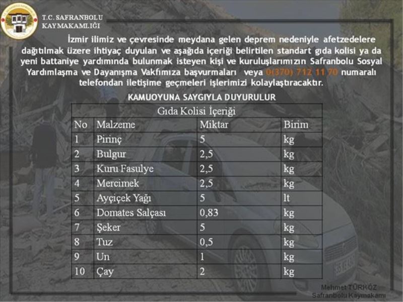 Safranbolu Kaymakamlığı yaptığı açıklamada, “ İzmir ilimiz ve çevresinde meydana gelen deprem nedeniyle afetzedelere dağıtılmak üzere ihtiyaç duyulan ve aşağıda içeriği belirtilen standart gıda kolisi yada yeni battaniye yardımında bulunmak istiyen kişi ve kuruluşlarımızın Safranbolu Sosyal Yardımlaşma ve Dayanışma vakfımıza başvurmaları veya 0370 712 11 70 numaralı telefondan iletişime geçmeleri işlemlerimizi kolaylaştıracaktır.” denildi.