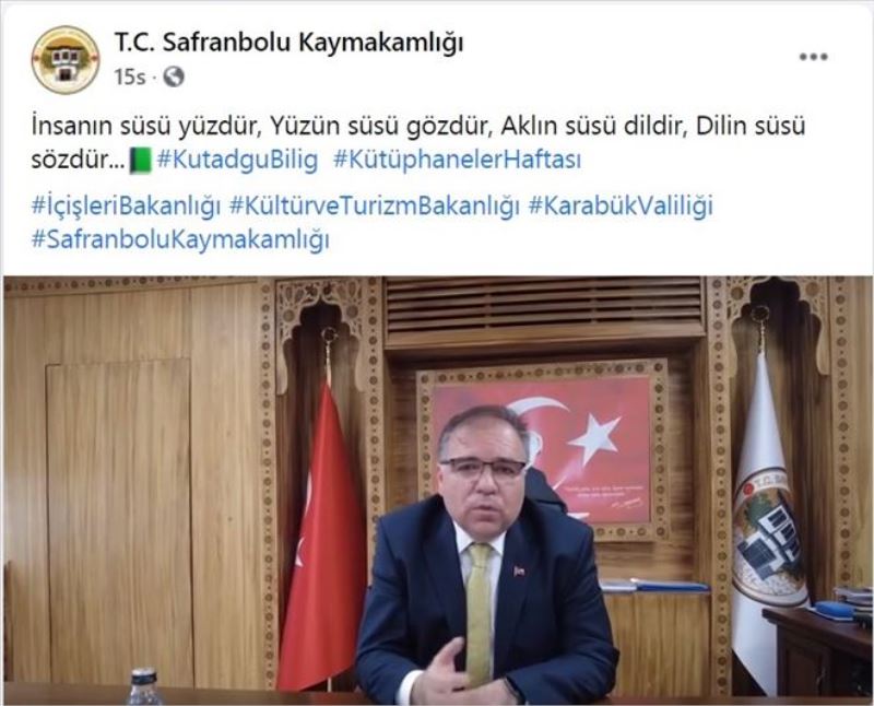 Safranbolu Kaymakamlığı tarafından Kütüphane Haftası etkinlikleri kapsamında anlamlı bir video hazırlanarak sosyal medya hesabından “İnsanın süsü yüzdür, Yüzün süsü gözdür, Aklın süsü dildir, Dilin süsü sözdür. KutadguBilig”mesajıyla paylaşıldı.