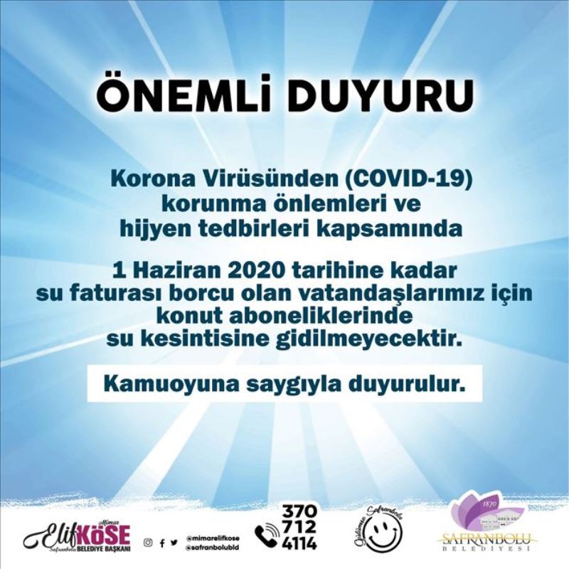 Çin´in Wuhan şehrinde ortaya çıkıp dünyayı etkisi altına alınan korona virüse karşı alınan tedbirler kapsamında Safranbolu Belediyesi tarafından yapılan açıklamada, “Korona Virüsünden (COVID-19) korunma önlemleri ve hijyen tedbirleri kapsamında 1 Haziran 2020 tarihine kadar su faturası borcu olan vatandaşlarımız için konut aboneliklerinde su kesintisi yapılmayacaktır. Kamuoyuna saygıyla duyurulur' ifadeleri kullanıldı.