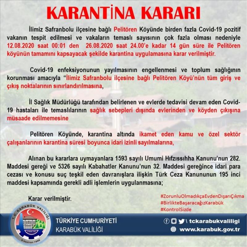 '14 gün süreyle Pelitören köyünün tamamını kapsayacak şekilde karantina uygulanmasına karar verilmiştir. Kovid-19 enfeksiyonunun yayılmasının engellenmesi ve toplum sağlığının korunması amacıyla ilimiz Safranbolu ilçesine bağlı Pelitören köyünün tüm giriş ve çıkış noktalarının sınırlandırılmasına, İl Sağlık Müdürlüğü tarafından belirlenen ve evlerde tedavisi devam eden Kovid-19 hastalarıyla temaslılarının sağlık sebepleri dışında evlerinden ve köylerinden çıkışına müsaade edilmemesine, Pelitören köyünde karantina altına ikamet eden kamu ve özel sektör çalışanlarının karantina süresi boyunca idari izinli sayılmalarına, alınan bu kararlara uymayanlara 1593 sayılı Umumi Hıfzıssıhha Kanunun 282. maddesi gereği ve 5326 sayılı kabahatler kanununun 32. maddesi gereğince idari para cezası ve konusu seç teşkil eden davranışlara ilişkin Türk Ceza Kanunun 195. maddesi kapsamında gerekli adli işlemlerin uygulanmasına karar verilmiştir.'