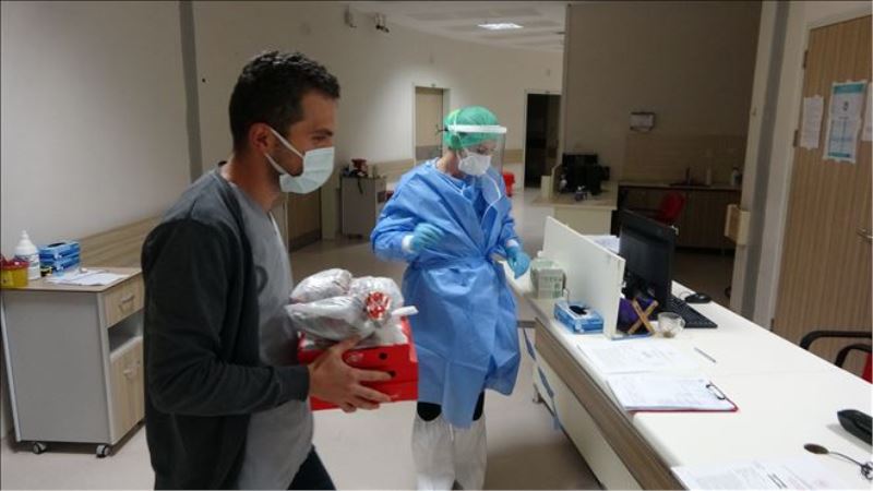 Kuryeler tarafından hastaneye getirilen ve kutularında “Covid-19 pandemi sürecinde göstermiş olduğunuz fedakarlık dolayısıyla siz değerli sağlık çalışanlarımıza teşekkür ederiz. İyi ki varsınız' yazılı pizzalar personeller tarafından teker teker dağıtıldı.