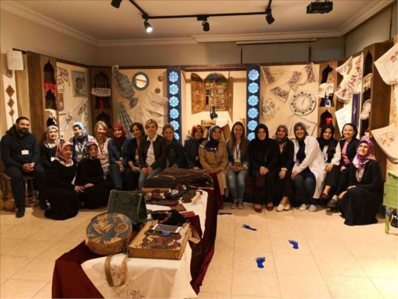 Meslek Edindirme kurslarında eğitim alan kursiyerlerin eserlerinden oluşan sergi ziyaretçilerini ağırlıyor.
