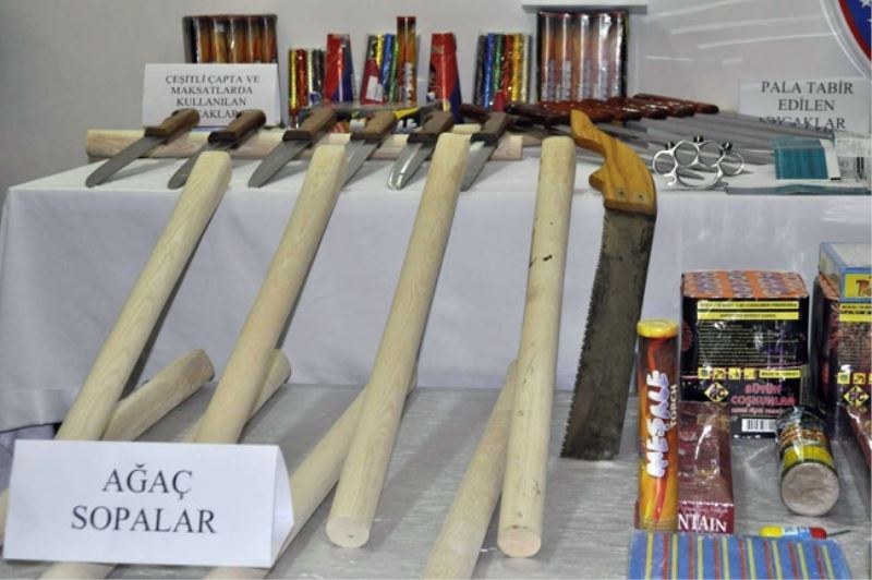 Kayseri’de Süper Kupa öncesinde polis ekiplerinin 6 ayrı arama noktasında gerçekleştirdiği aramalarda 82 adet sopa, 50 adet pala, iki adet muşta, balta, testere ve patlayıcı maddeler ele geçirildi.İl Emniyet Müdürü Mustafa Aydın, Süper Kupaöncesinde gereken tüm önlemlerin alındığını veGalatasaray’ın kazandığı maç sonrasında herhangi bir olay yaşanmadığını belirtti. Mustafa Aydın, müsabakanın güvenlik bir şekilde oynanması için şehir girişlerinde 6 farklı noktada arama gerçekleştirdiklerini söyledi. Aydın, “Bu aramalarda pala tabir edilen bıçak olmak üzere 50 adet bıçak, 2 adet muşta, bir adet balta ve testere, özel olarak hazırlanmış 82 adet sopa, çok sayıda proteknik patlayıcı madde olarak tabir edilen 350 adet maytap, 250 adet torpil, 150 adet havai fişek ve volkan ele geçirildi” dedi.Emniyet Müdürü Mustafa Aydın, maç sırasında 3 bin 800 polis memurunun görev yaptığını, 750 polis memurunun ise diğer illerden takviye olarak geldiğini kaydederek, “Maçta 500 özel güvenlik elemanı da görev yaptı. Bayram zamanında meslektaşlarımız tatillerinden fedakarlık yaparak görev yaptılar. Buradan maç sırasında görev yapan tüm personelimize özverili çalışmalarından ötürü teşekkür ediyorum” diye konuştu.