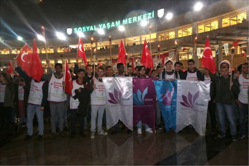 Sağlık Kültür ve Spor Daire Başkanlığı tarafından düzenlenen etkinlik kapsamında kampüsteki bayrak alanında toplanan öğrenciler, ellerinde Türk bayrakları ve meşalelerle Sosyal Yaşam Merkezi´ne kadar yürüdü. Gruba, üniversiteli öğrencilerden oluşan “Göktürk MC” isimli kulübün motosikletli öğrencileri de eşlik etti.
