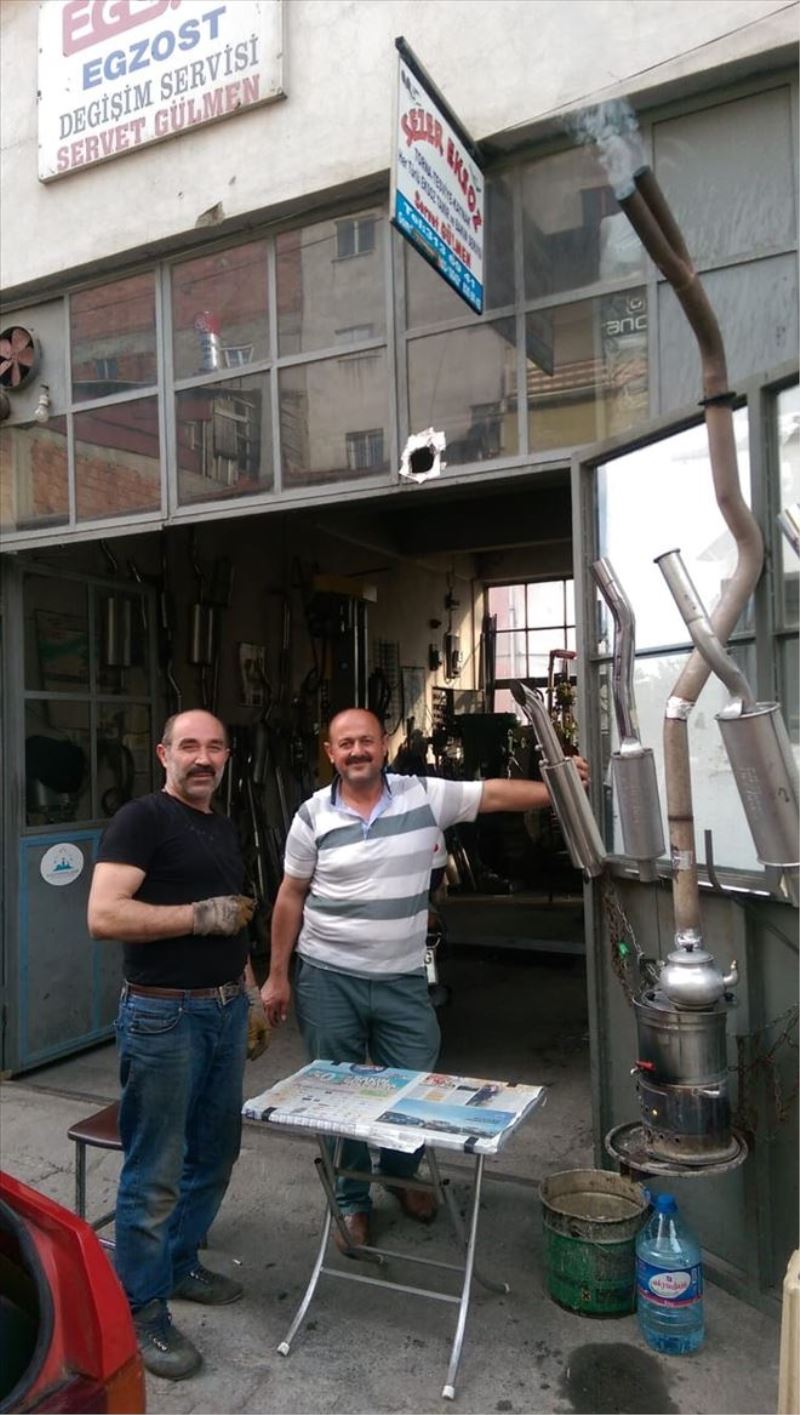 25 yıldır sanayide egzoz ustası olarak görev yapan Servet Gülmen, “Yaklaşık 1 ay önce bizim sanayide bulunan çay ocağı kapandı. İlk zamanları çok zorlandık. Küçük tüplerde esnaf dükkanlarında çay demlemeye başladık. Bazen işlerin yoğunluğu nedeniyle küçük tüp üzerinde çaydanlıkları unutup sıkıntılı anlar yaşadık. Birkaç esnaf arkadaşımız gerçek çay tadını almak için semaverde çay demlemek istedi fakat semaverden çıkan duman diğer esnaf arkadaşların dükkanına girdi ve rahatsız oldu. İşte o an aklıma bu fikir geldi ve daha önce defolu olarak almış olduğum egzozu semaverin bacasına monte ettim. İlk denememde başarılı olamadım çünkü egzoz semaverin dumanını çekmedi. Daha sonra çift çıkışlı ve çift ağızlı egzozu monte ettim. Semaveri yaktığım anda çift ağızlı egzoz dumanı yukarı çekti. Yaklaşık 3 metreyi bulan çift egzozlu semaver ile dumandan yukarıya verdik ve çay demledik. Demlenen çayı içen müşterilerimiz ve esnaf arkadaşlarım çok memnun kaldı” dedi.