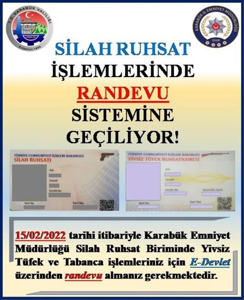 Karabük İl Emniyet Müdürlüğü tarafından yapılan duyuruda, 15 Şubat tarihi itibariyle Karabük Emniyet Müdürlüğü Silah Ruhsat Biriminde yivsiz tüfek ve tabanca işlemleri için e-devlet üzerinden randevu alınması gerekliliği ifade edilerek, “Silah Ruhsat Kartlarının 17/07/2025 tarihine kadar Yeni Nesil Silah Ruhsat Kartı ile Yivsiz Tüfek Ruhsatnamelerinin ise 01/03/2023 tarihine kadar Yeni Nesil Tüfek Kartlarıyla değiştirilmesi gerektiğinden silah ruhsat başvuruları için randevu sistemi getirilmiş olup, randevu işlemleri e-Devlet sisteminde açılmıştır. Yeni Nesil Silah Ruhsat Kartı ve Yeni Nesil Tüfek Kartlarıyla ilgili iş ve işlemlerinde vatandaşlarımız e-Devlet sistemi üzerinden randevu oluşturarak zaman kaybetmeden randevu gününde işlemlerini silah ruhsat birimlerinden gerçekleştirebileceklerdir. Vatandaşlarımızın mağduriyet yaşamamak için ilgili ruhsatlarını yenilemeleri istifadelerine olacaktır. Karabük İl Emniyet Müdürlüğü olarak her konuda olduğu gibi idari hizmetler konusunda da tüm unsurlarımız cansiperane görev yapmaya devam etmektedir.” denildi.