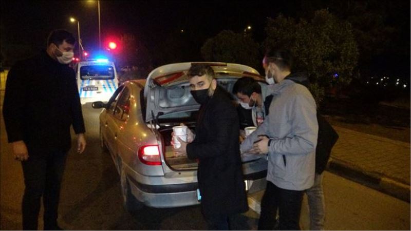Yeşil Mahalle Muhtarı Cihan Demirtaş aza ve arkadaşları ile birlikte sokağa çıkma kısıtlaması kapsamında uygulama yapan polisleri ziyaret ederek sıcak çorba dağıttı.