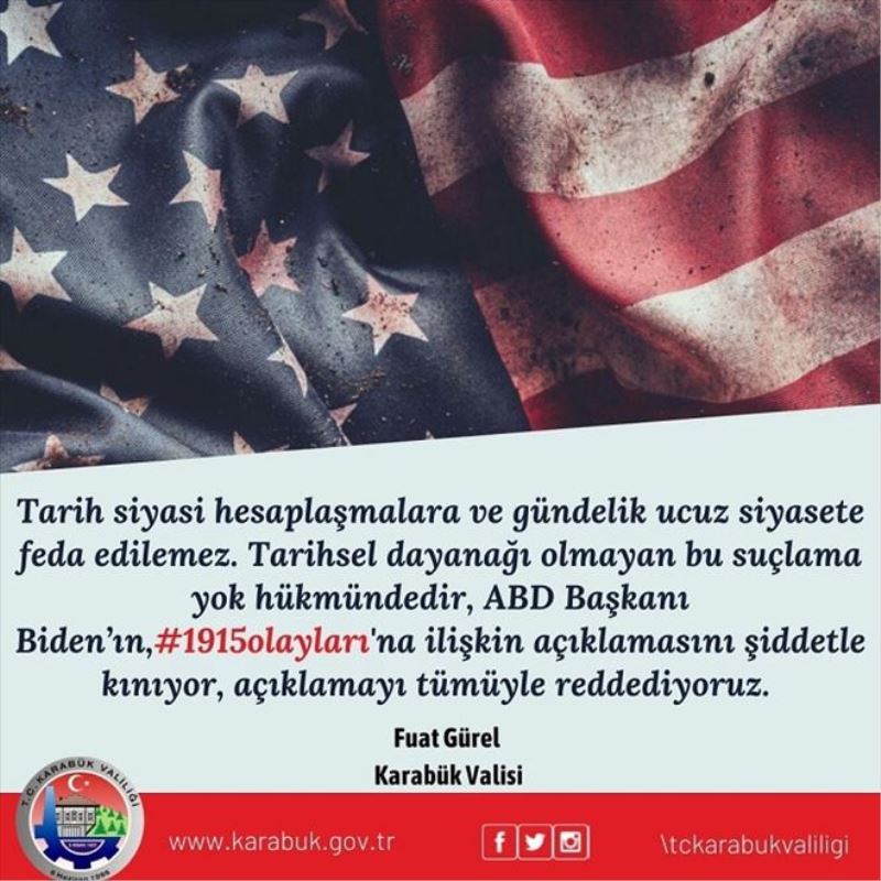 Vali Fuat Gürel, Karabük Valiliği sosyal medya hesabından yaptığı paylaşımda ABD Başkanı Joe Biden´ın ta-rihsel dayanağı olmayan iftiralarına tepki göstererek, “Tarih siyasi hesaplaşmalara ve gündelik ucuz siyasete feda edilemez. Tarihsel dayanağı olmayan bu suçlama yok hükmündedir. ABD Başkanı Biden´ın #1915olayları´na ilişkin açıklamasını şiddetle kınıyor, açıklamayı tümüyle reddediyoruz.” dedi.