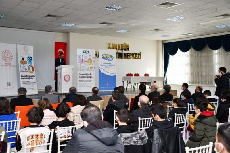 Karabük TSO Meclis Başkanı Hüsnü Salih Yılmaz, mesleki ve teknik eğitim hakkındaki eki neden hazırladıkları ve verdikleri öneme değindiği bir konuşma yaparak, “Bilindiği üzere Karabük Ticaret ve Sanayi Odası 1954 yılında kurulduğu günden itibaren mesleki ve teknik eğitimin üzerine eğilmiş, destekçisi ve hamisi olmuş bir sivil toplum kuruluşu oldu. Ticaret ve Sanayi Odası olarak; ‘Güçlü Türkiye´nin yolu, Üreten Türkiye´den geçer´ diyoruz. Dünyayla rekabet konusunda ilerlemeci adımlar atan ülkemizi daha hızlı kalkındırmak için çocuklarımızı mesleki ve teknik okullara yönlendirmek ise Ticaret ve Sanayi Odası olarak eğitimdeki önceliklerimiz arasında bu nedenle program sonunda sizlere dağıtılacak ekleri hazırladık. Başta rehber öğretmenlerimizin bilgilendirilmesi çok kıymetli. Aileleri, ilgili ve yetenekli öğrencileri mesleki-teknik liselere yönlendirmeleri, önlerindeki büyük istihdam ve kaliteli yaşam fırsatlarını göstermeleri yetişmiş insan kaynağının artmasını hızla sağlayacaktır” dedi.