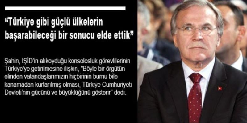 Şahin, IŞİD’in alıkoyduğu konsolosluk görevlilerinin Türkiye`ye getirilmesine ilişkin, 'Böyle bir örgütün elinden vatandaşlarımızın hiçbirinin burnu bile kanamadan kurtarılmış olması, Türkiye Cumhuriyeti Devleti`nin gücünü ve bü