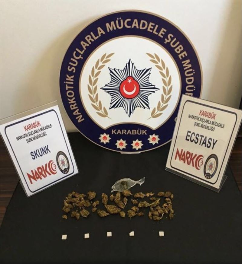 Edinilen bilgiye göre, Karabük Narkotik Suçlarla Mücadele Şube Müdürlüğü ekiplerince yapılan çalışmalar neticesinde İstanbul´dan Karabük´e uyuşturucu madde getiren Y.H. ve E.G isimli şahısları gözaltına alındı. Kiralık araçla Karabük´e geldikleri belirlenen şüphelilerin Bölge Trafik önünde durdurulup gözaltına alındığı belirtildi. Operasyon kapsamında araç sürücüsü Y.H isimli şahıstan 6.47 gram SKANK uyuşturucu madde, E.G isimli şahıstan 9.30 gram SKANK, 1.27 gram Macun ve 5 Adet kral figürlü extacy uyuşturucu madde ele geçirildi.