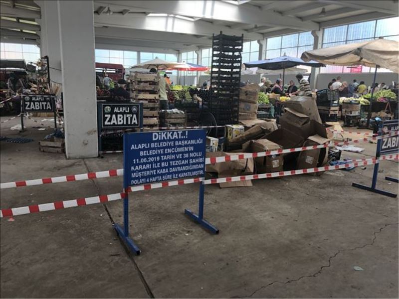 Alaplı Belediyesi Zabıta Müdürlüğü, Çarşamba Pazarı alanında bir satıcının müşteriye sözlü olarak hakaret ettiği yönündeki şikayet üzerine esnafın tezgah açmasına izin vermedi. Esnafın tezgah açtığı alan zabıta ekiplerince demir ile kapatılan yere ´Pazar yerinde tüketiciye karşı sözlü fiili kötü muamelede bulunulması nedeniyle bu alan 4 hafta süreyle men edilmiştir´ yazısı konuldu. Esnaf, Çarşamba günlerinde kurulan pazarda tezgahını açamadı.