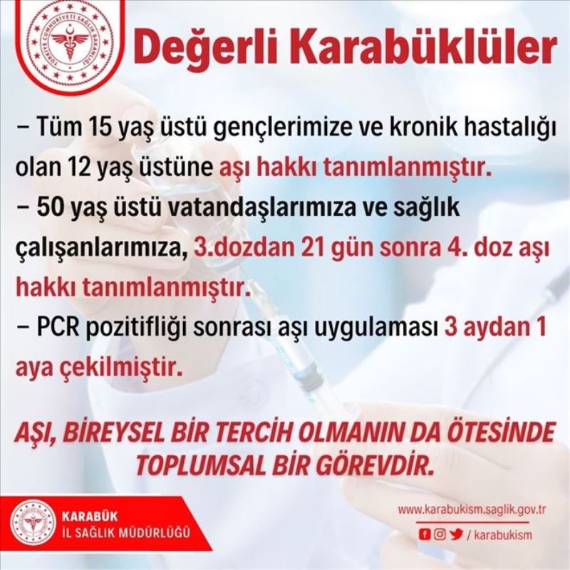 Karabük İl Sağlık Müdürlüğü tarafından yeni aşı haklarının tanımlandığını ifade eden bir duyuru yapılarak, “Tüm 15 yaş üstü gençlerimize ve kronik hastalığı olan 12 yaş üstüne aşı hakkı tanımlanmıştır. 50 yaş üstü vatandaşlarımıza ve sağlık çalışanlarımıza, 3. Dozdan 21 gün sonra 4. Doz aşı hakkı tanımlanmıştır.” denildi.