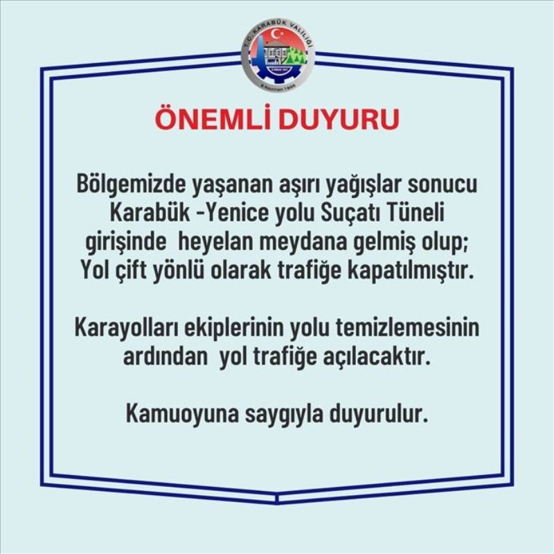 Karabük Valiliği´nden yapılan açıklamada, 'Bölgemizde yaşanan aşırı yağışlar sonucu Karabük-Yenice yolu Suçatı Tüneli girişinde heyelan meydana gelmiş olup, yol çift yönlü olarak trafiğe kapatılmıştır. karayolları ekiplerinin yolu temizlemesinin ardından yol trafiğe açıklacaktır.'