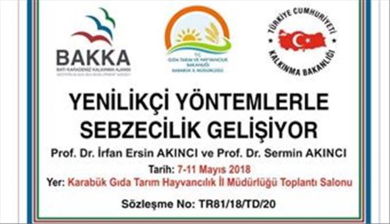 Karabük İl Gıda Tarım ve Hayvancılık Müdürlüğü, “İl Müdürlüğümüzce hazırlanan ´´Yenilikçi Yöntemlerle Sebzecilik Gelişiyor´´ isimli projemiz, Batı Karadeniz Kalkınma Ajansı (BAKKA) tarafından uygulanabilir görülmüştür. Bu kapsamda İlimizde faaliyet gösteren Ziraat Mühendislerine yönelik; açık alanlar ve seralarda yetiştirilen sebzeciliğin sürdürülebilir olması, ürün veriminin artırılması ve yenilikçi yöntemlerin uygulanabilmesi için Prof. Dr. İ. Ersin AKINCI ve Prof. Sermin AKINCI tarafından sebze yetiştiriciliği konusunda teorik ve pratik eğitim verilecektir.
