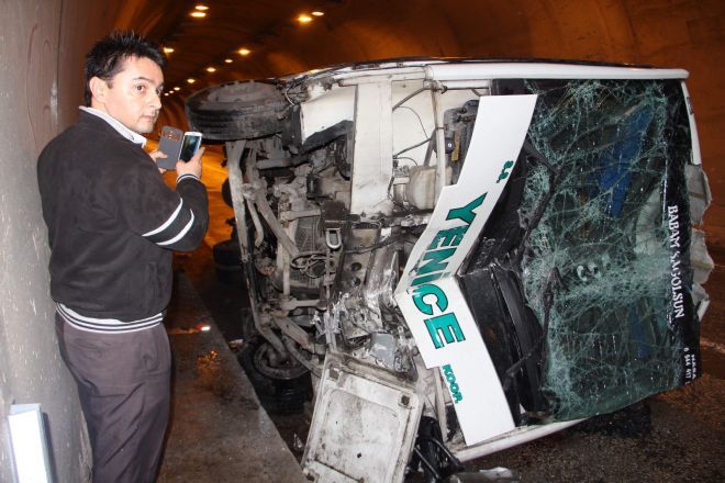 Edinilen bilgiye göre, Yenice ilçesinde Karabük’e seyir halinde olan Hasan Arat (32) 78 M 5009 plakalı yolcu minibüs, Çakmakkaya Tüneli girişinde aşırı yağışlar sonrası dağdan kopup yola düşen kayalara çarptı. Çarpmanın etkisiyle denge kolu kırılan minibüs, tünelin girişine çarparak devrildi.