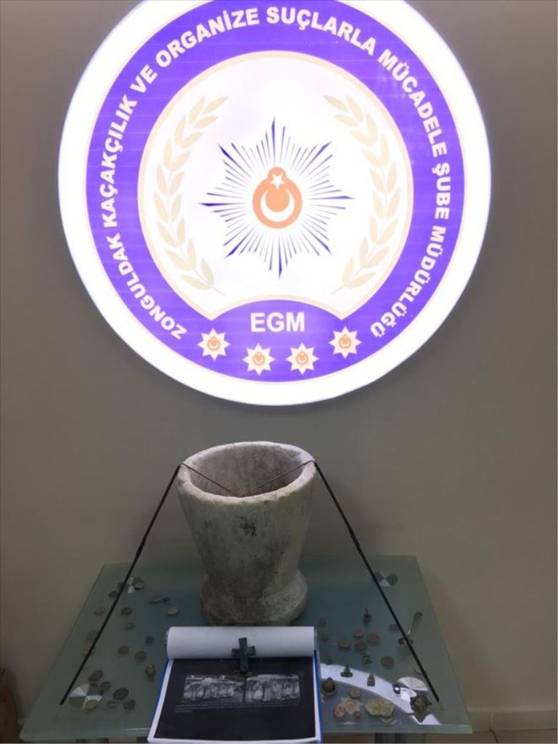 Ele geçirilen tarihi eserlere el konulurken şüpheli iki kişinin emniyetteki sorguları sürüyor.